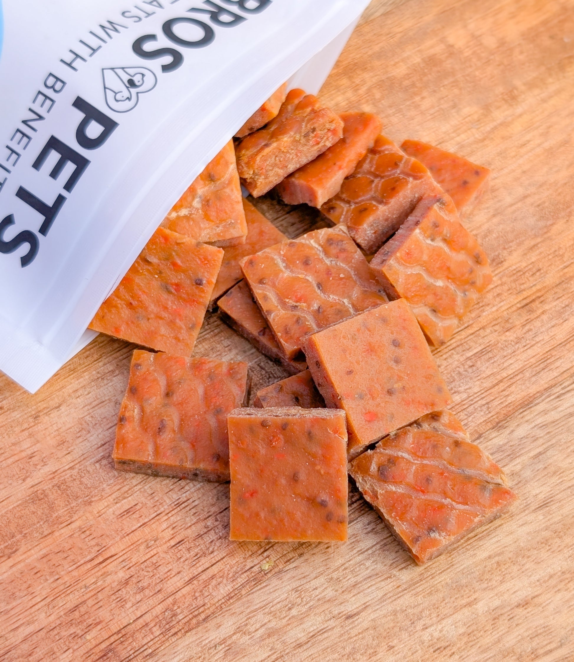 Bros Pets Rabbit & Carrot Bites are soft, functional treats made with an impressive 79.2% rabbit and 8% carrot – a meaty, veggie-packed reward designed to support your pup’s whole-body health. From joint care to digestion, these bites deliver targeted benefits in every tasty mouthful.