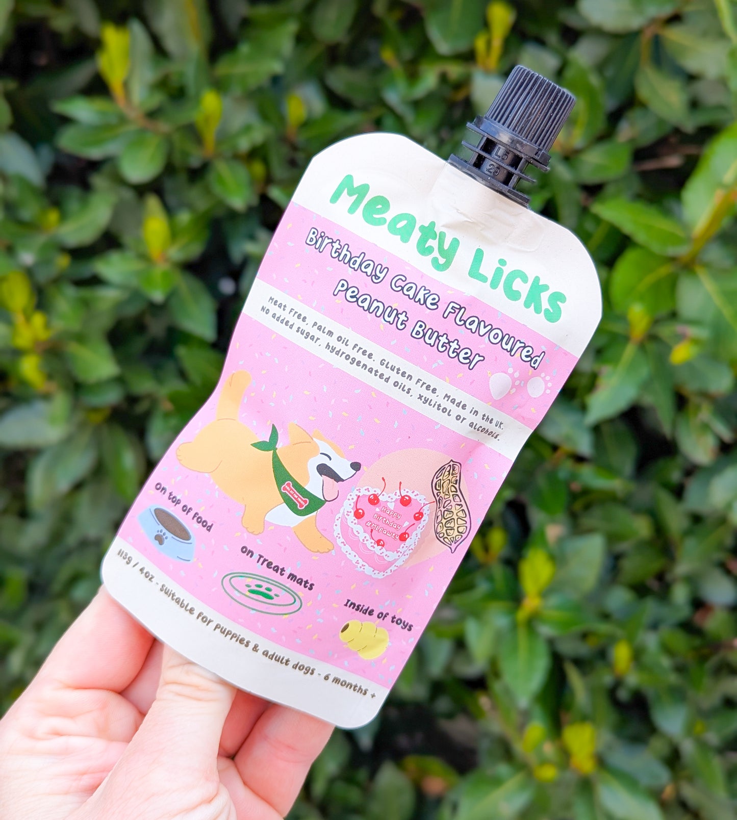 Meaty Licks Squeezy Peanut Butter Pouch | Birthday Cake